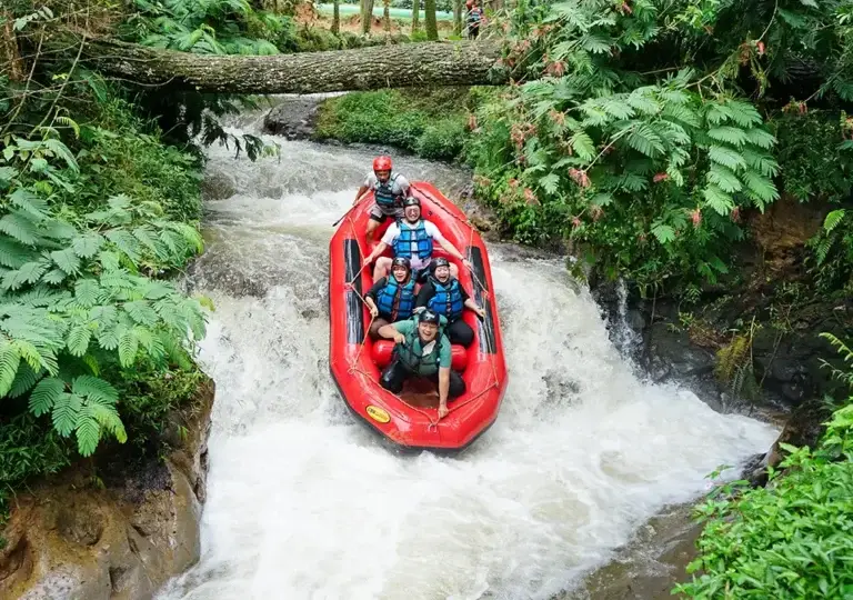 Rafting jelajah alam menggunakan perahu karet dan ditemani Tour Guide berpengalaman di Sungai Palayangan sepanjang 4,5KM
